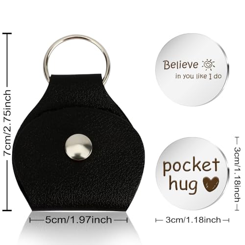 POCKET HUG TOKEN: you will receive a stainless steel pocket hug token and 1 piece of PU leather keychain. The stainless steel token keepsake is double sided designed. The Front: “Pocket Hug”; The Back:”Believe in you like I do.” The pocket hug keychain can express your love and care for your loved ones and touch and inspire them.