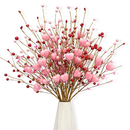 J’FLORU Valentine’s Day Gifts Valentines Day Decorations 24 Pack Pink Heart Shaped Berry Picks with Red Berries for Valentines Day Wedding Candlelight Dinner Anniversary